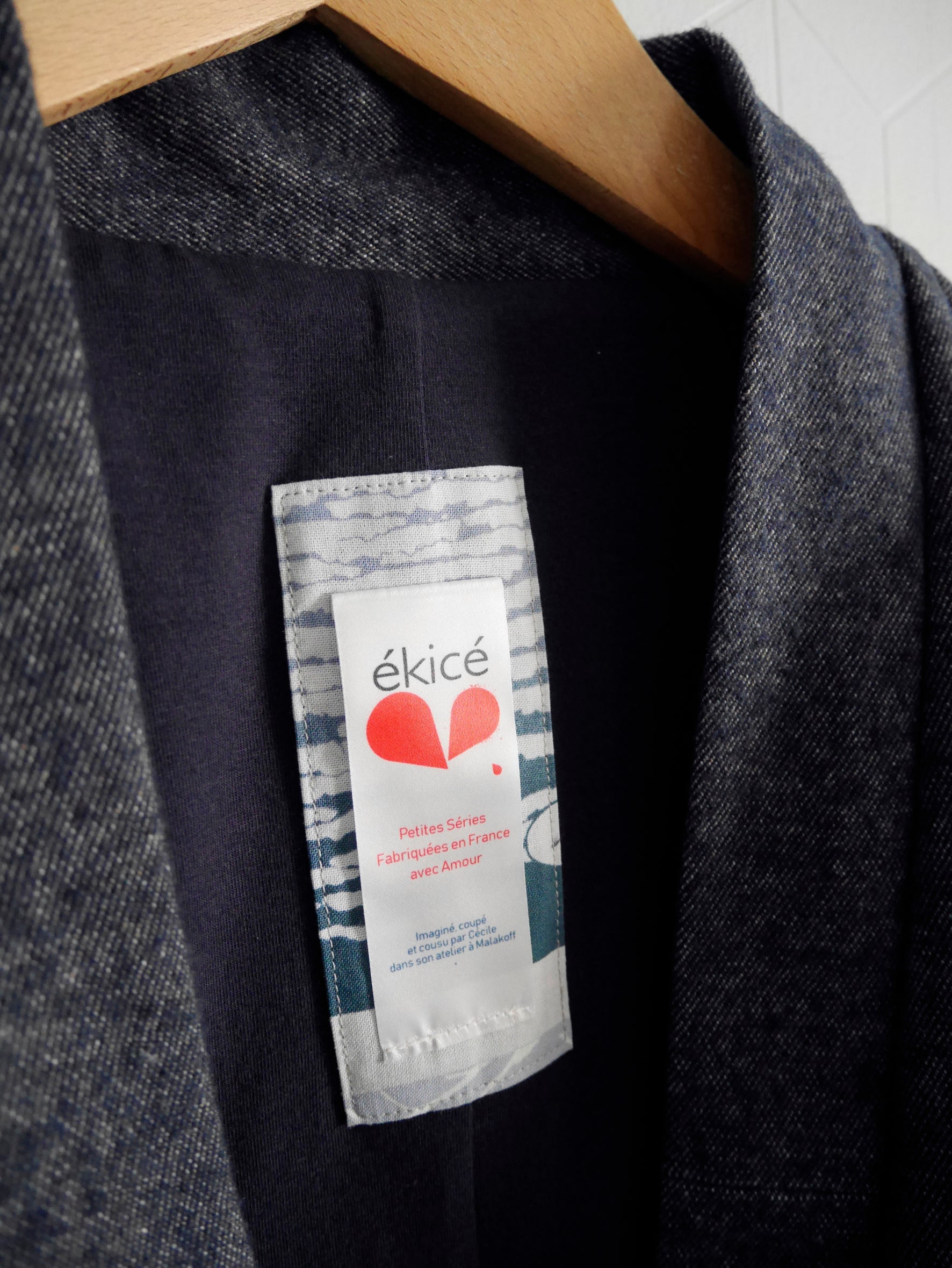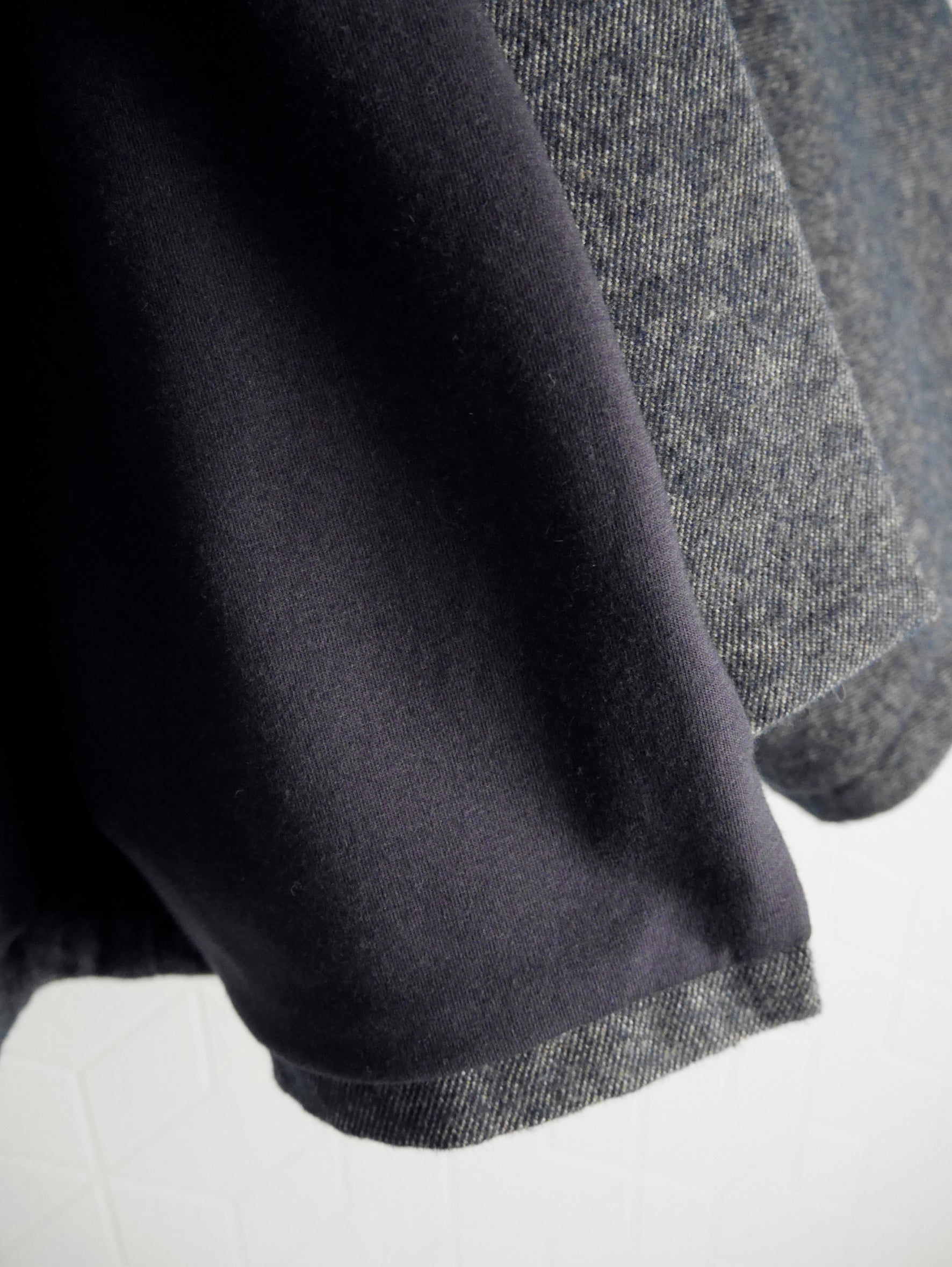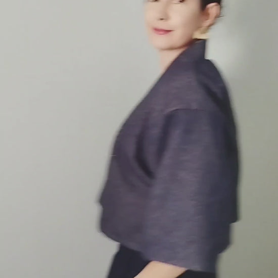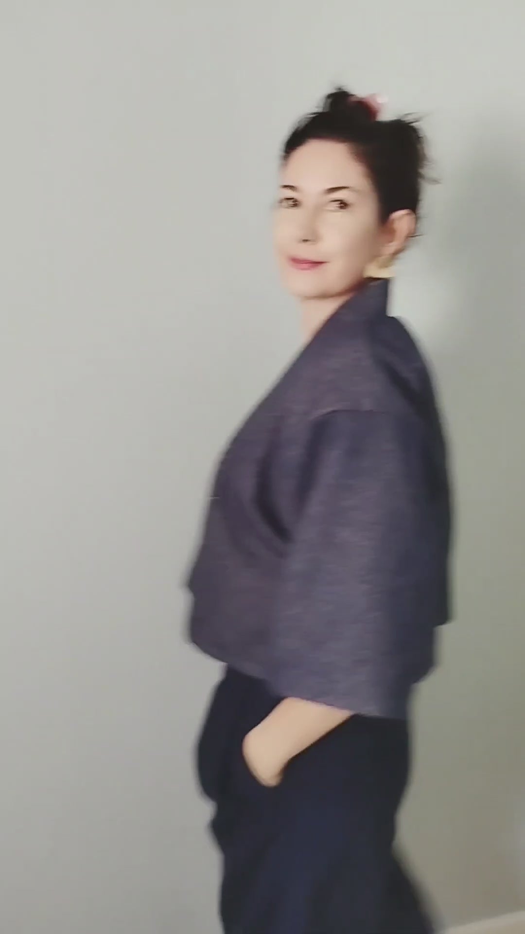 • Veste courte inspirée du kimono en tissu mélangé laine et coton au joli tissage sergé légèrement duveteux bleu foncé chiné. Elle est entièrement doublée de jersey de coton tout doux bleu foncé. La veste se porte bord à bord, sa coupe est ample en haut puis droite, légèrement allongée au dos. Col kimono, couture milieu dos.