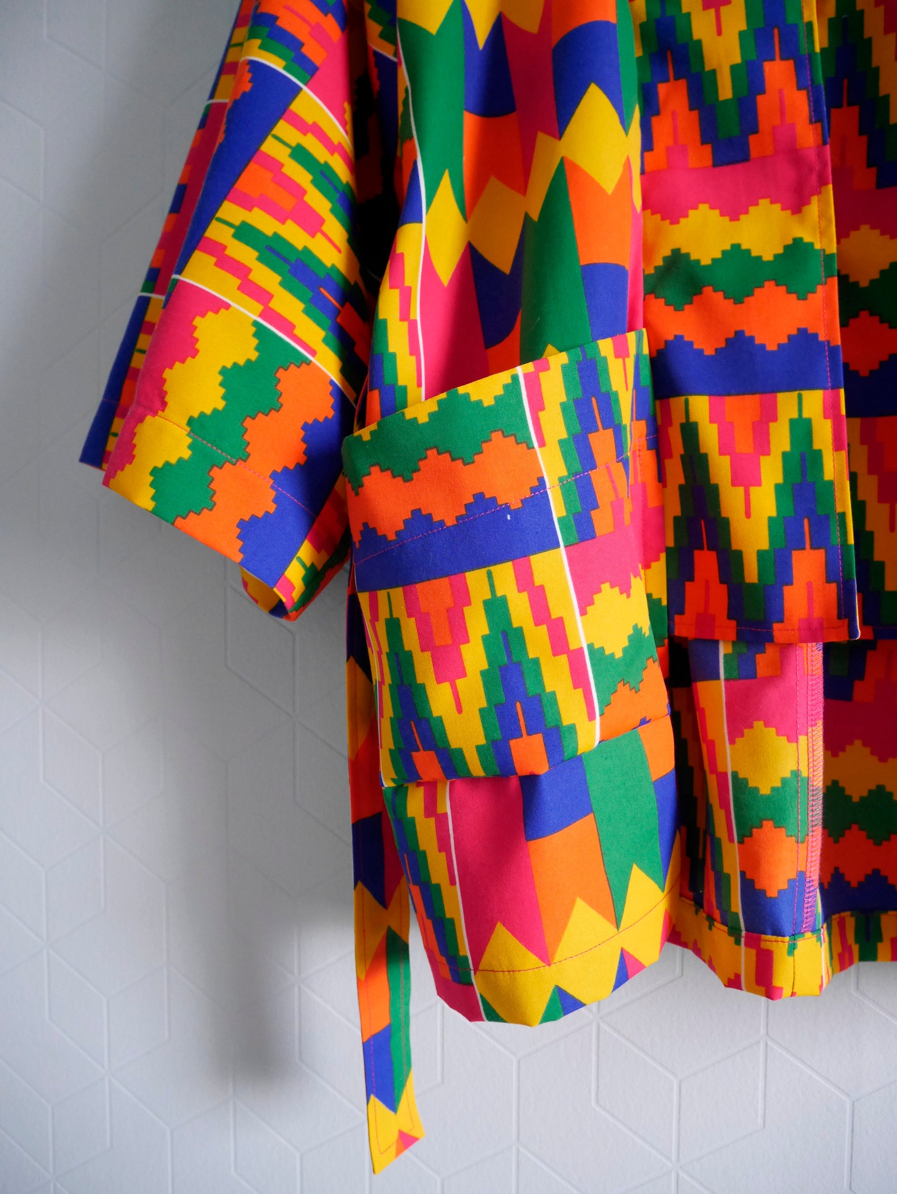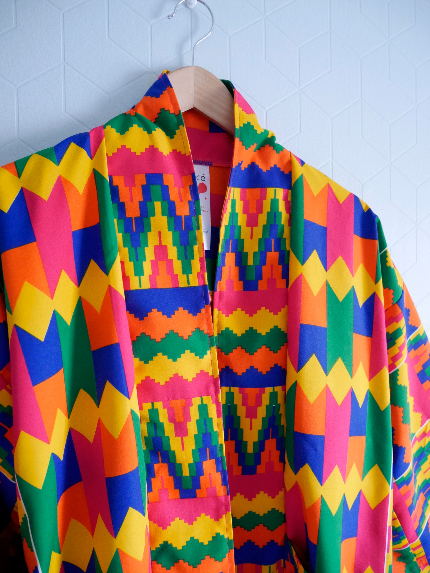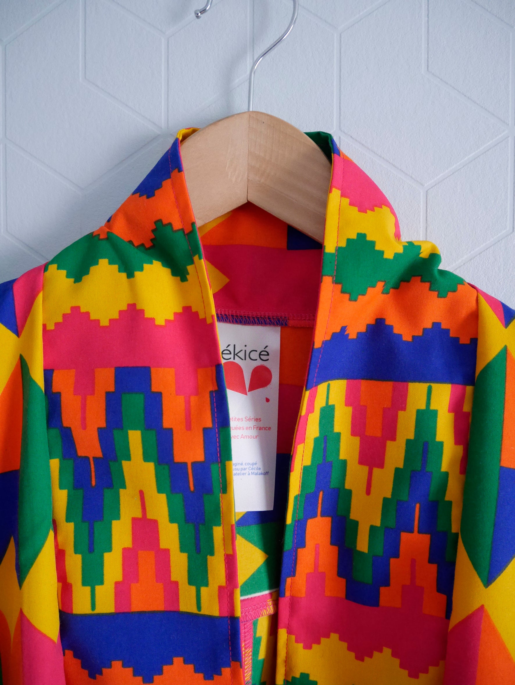 •  Kimono ceinturé en tissu imprimé d'inspiration Kente Ghanéen, aux jeux de motifs à carreaux et lignes de couleurs jaune, bleu, vert, rose et orange. Ça a été un sacré travail de placer le motif de manière symétrique et poétique ! Coupe droite, 2 poches plaquées devant, large col kimono doublé. Ceinture coordonnée qui passe par 2 passants sur les côtés, et que l'on peut choisir de retirer.