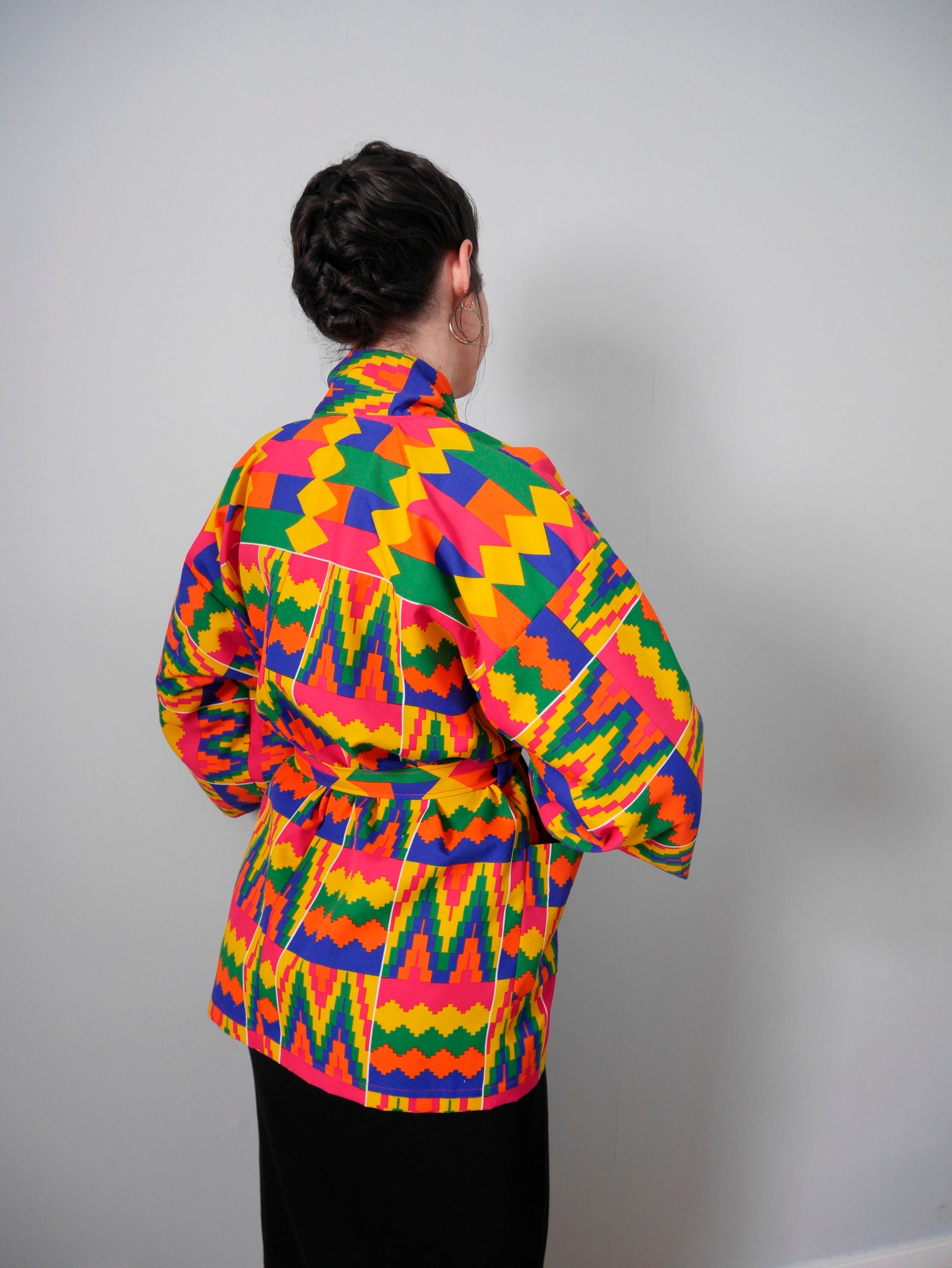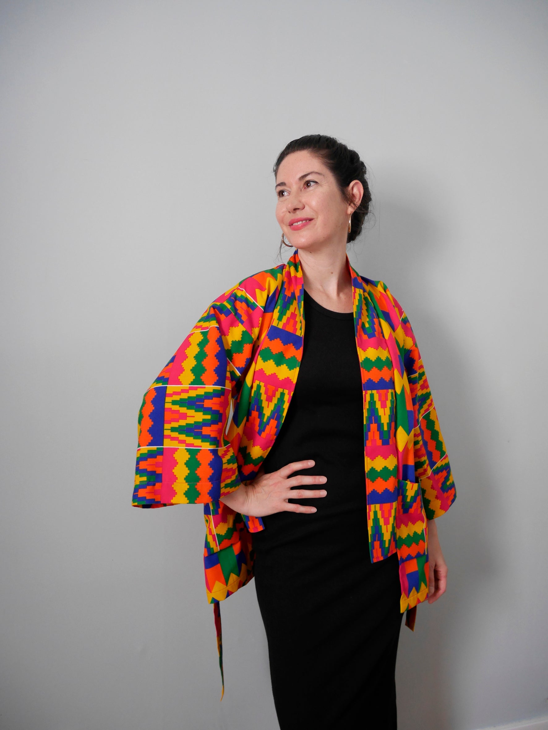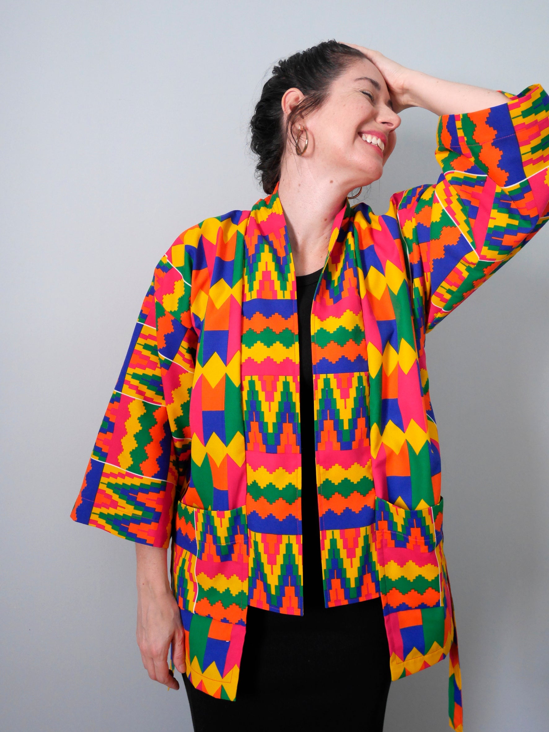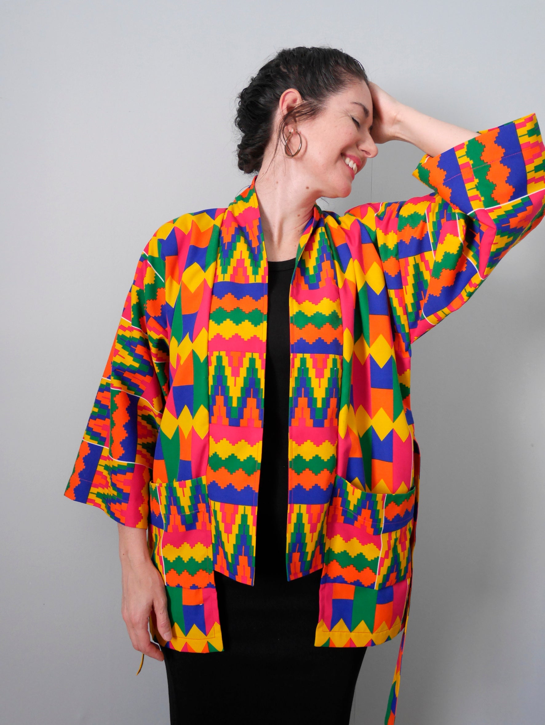 •  Kimono ceinturé en tissu imprimé d'inspiration Kente Ghanéen, aux jeux de motifs à carreaux et lignes de couleurs jaune, bleu, vert, rose et orange. Ça a été un sacré travail de placer le motif de manière symétrique et poétique ! Coupe droite, 2 poches plaquées devant, large col kimono doublé. Ceinture coordonnée qui passe par 2 passants sur les côtés, et que l'on peut choisir de retirer.
