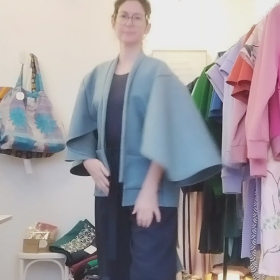 • Veste Cape inspirée du kimono, en pure laine au tissage sergé (lignes en diagonales) légèrement chiné d'un vert sauge très doux.