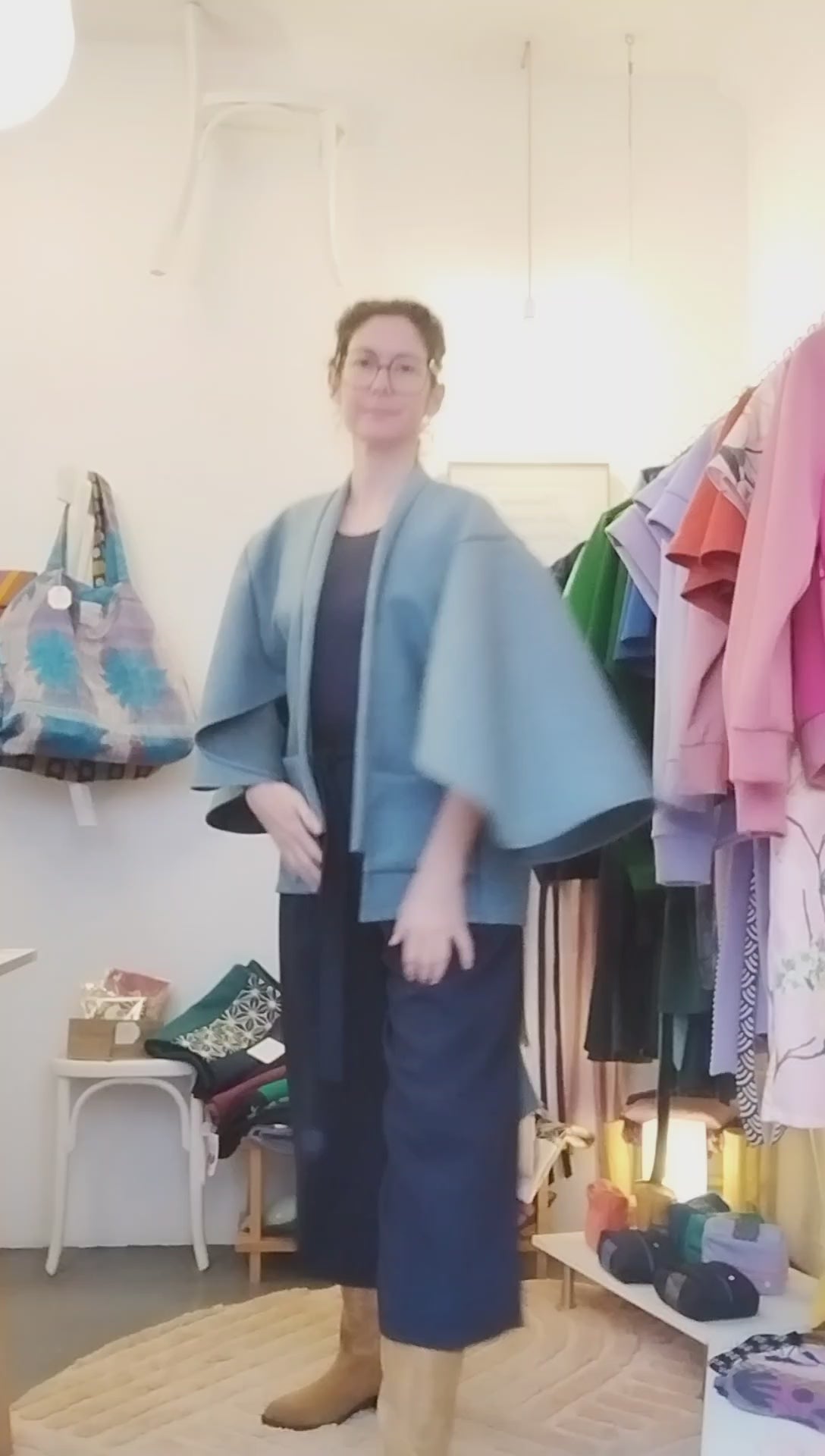 2 grandes poches arrondies plaquées devant, manches ouvertes très larges qui forment un effet cape. Col kimono, couture milieu dos. La veste se ceinture devant à l'aide de deux liens attachés aux côtés.porte bord à bord, coupe droite, légèrement allongée au dos.