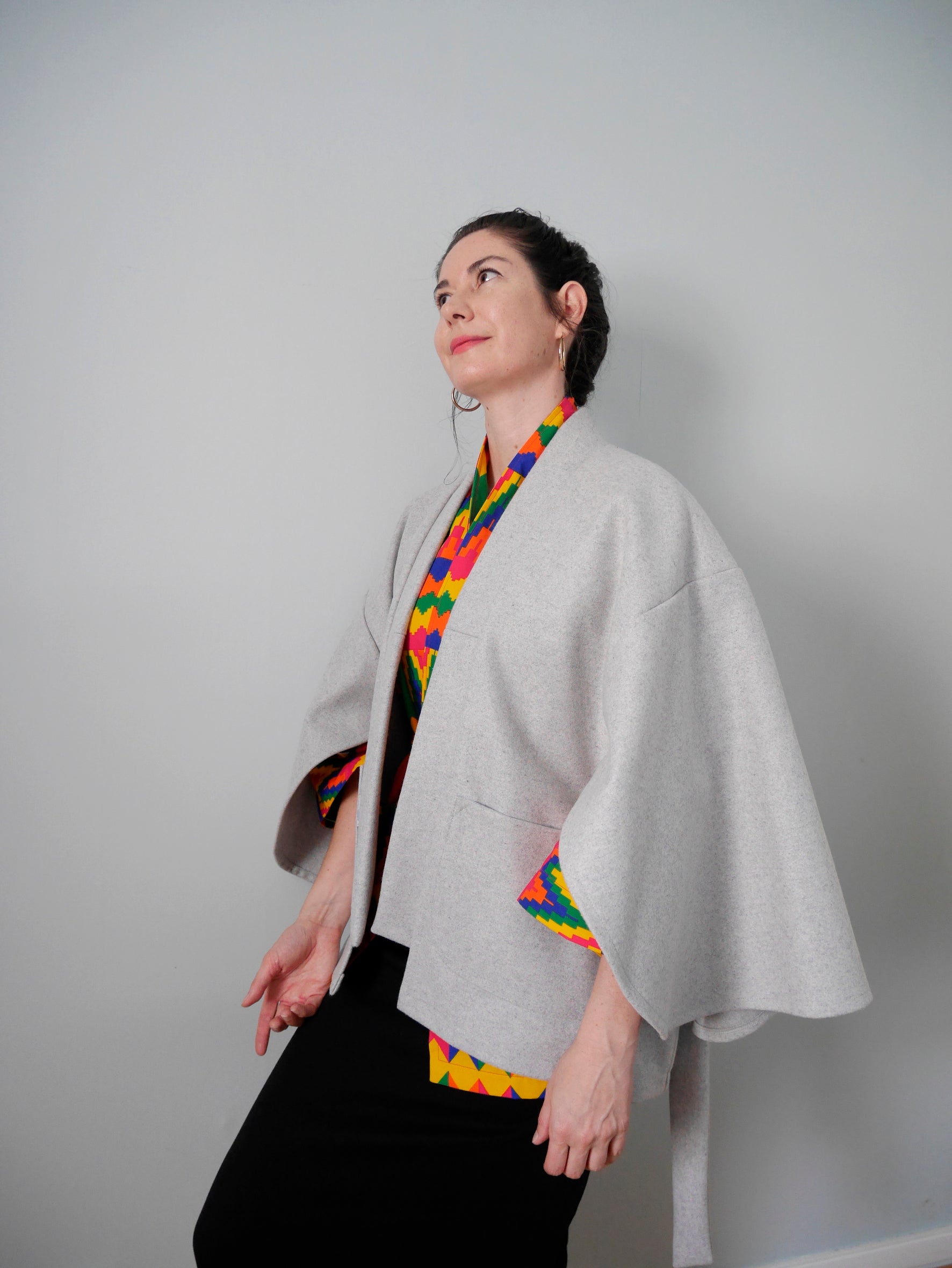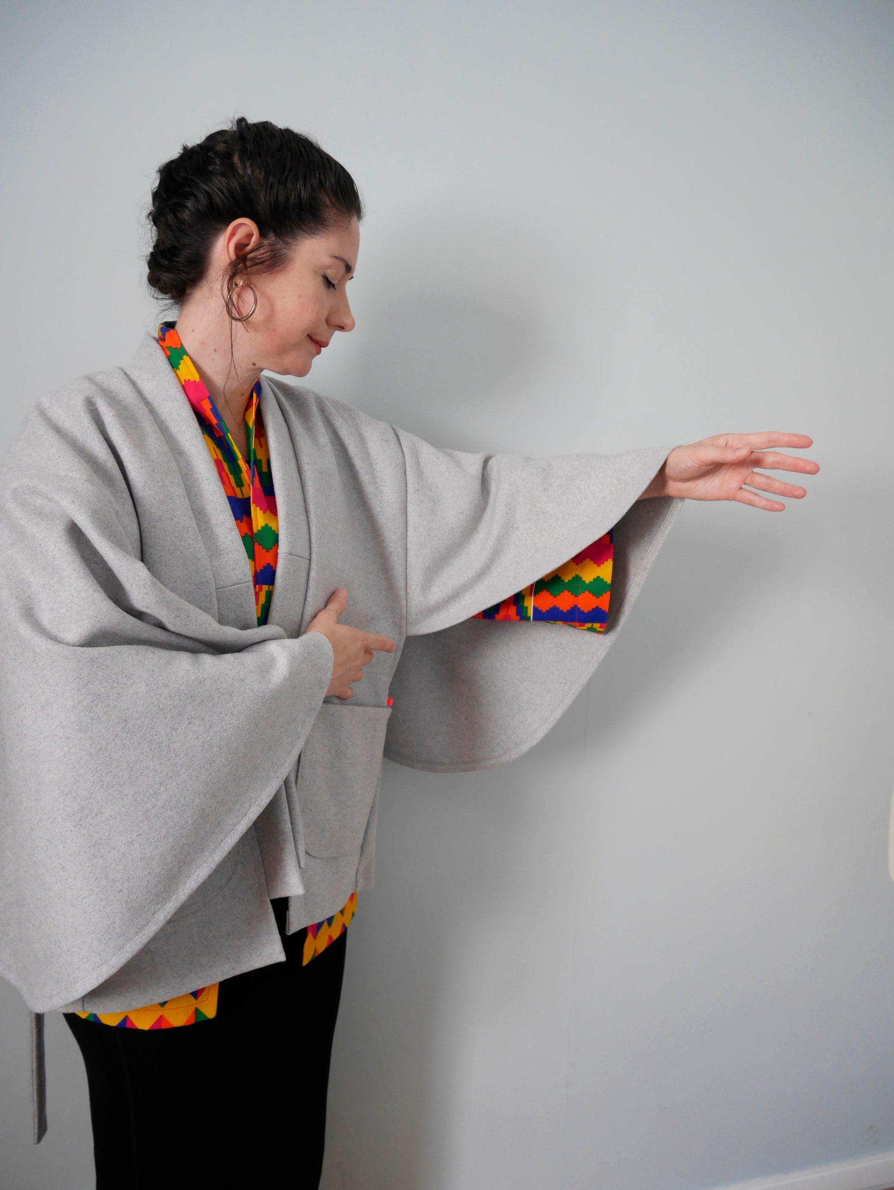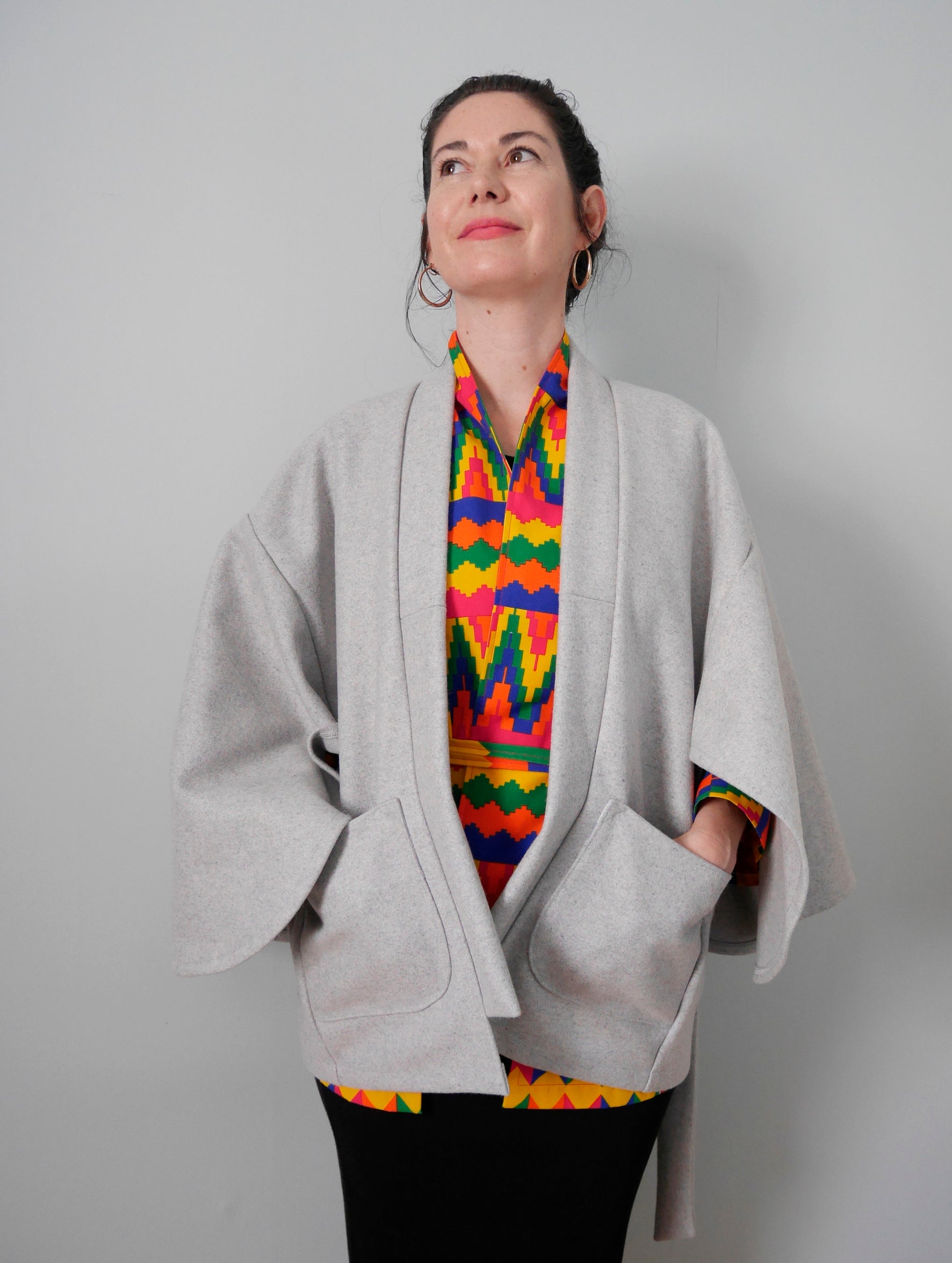 • Veste esprit cape ceinturée inspirée du kimono, en pure laine feutrée couleur gris clair chiné. Les côtés sont fermés avec 2 grandes poches arrondies plaquées devant. Les manches sont ouvertes et permettent d'enfiler le manteau sur toutes les tenues même les manches larges ou un autre manteau. (sur les photos je la porte avec un kimono dessous.) Col kimono, couture milieu dos. La veste peut se ceinturer devant à l'aide de deux liens attachés aux côtés.