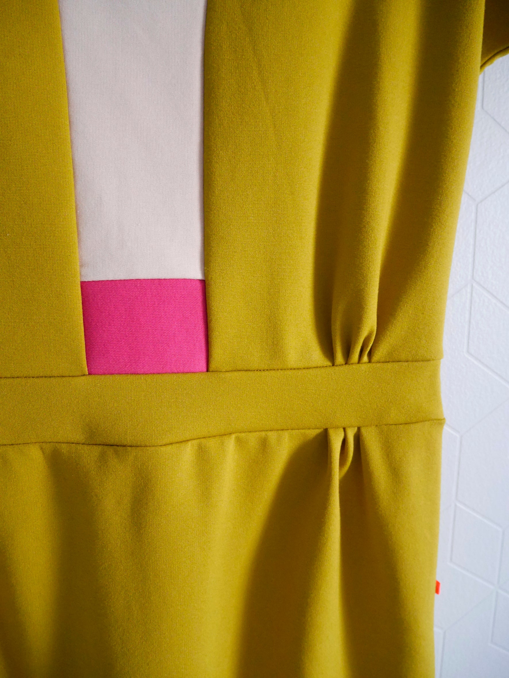 Découpe de col hyper graphique, avec un mélange de couleurs : beige rosé et rose vif. Manches courtes. Longueur au dessus des genoux, petit fendu au dos.