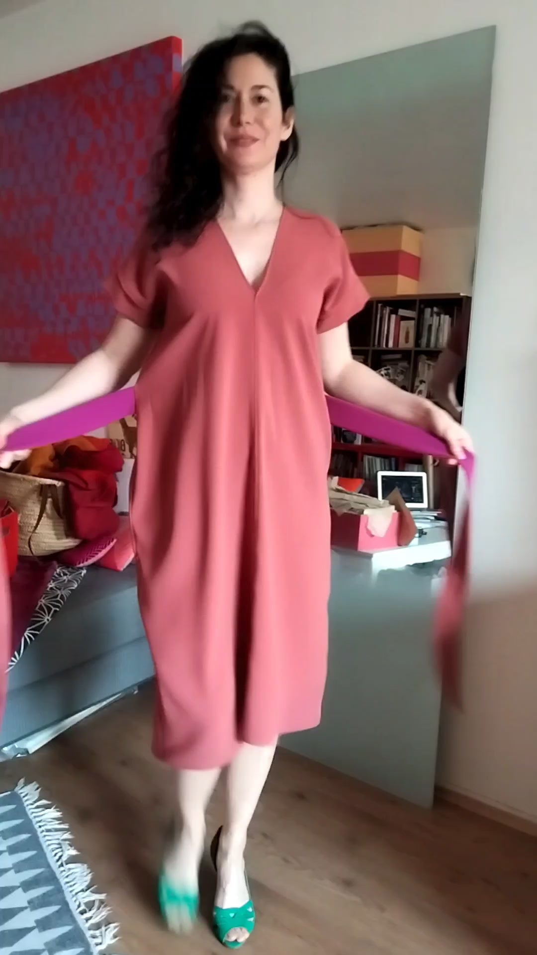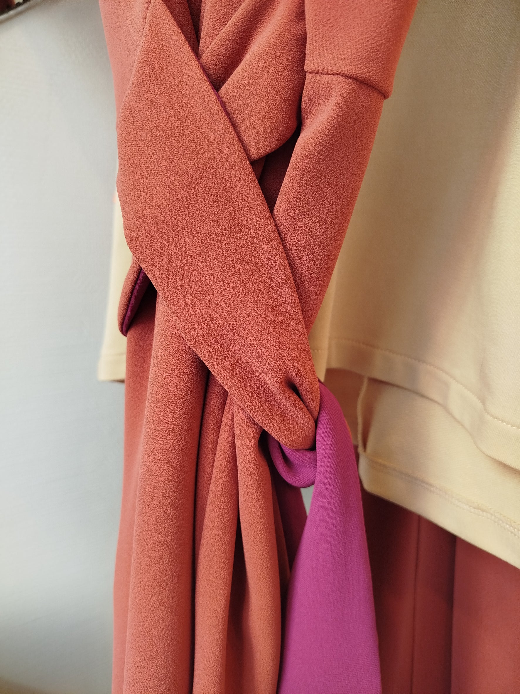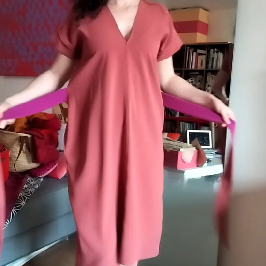 • Robe super fluide en beau crêpe mat d'une jolie couleur chaude rose caramélisé. La robe s'enfile par le bas et les liens des côtés permettent de resserrer la taille en passant d'abord devant pour se nouer au dos. La robe ainsi nouée fait des plis graphiques devant, et un petit arrondi sur les hanches sublime subtilement les formes. Pas de poches sur celle ci !