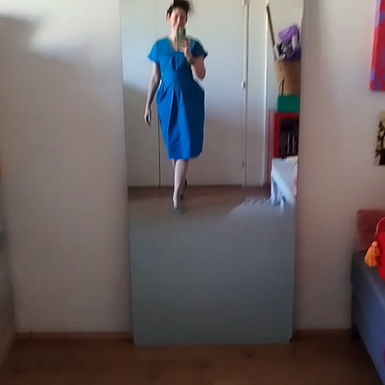 • Robe de printemps mi longue hyper féminine en beau sergé de coton épais couleur bleu cyan intense. (tire légèrement sur le turquoise mais ceci est un débat sans fin)