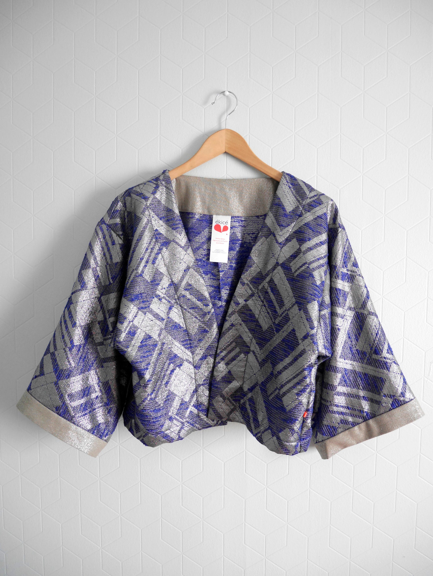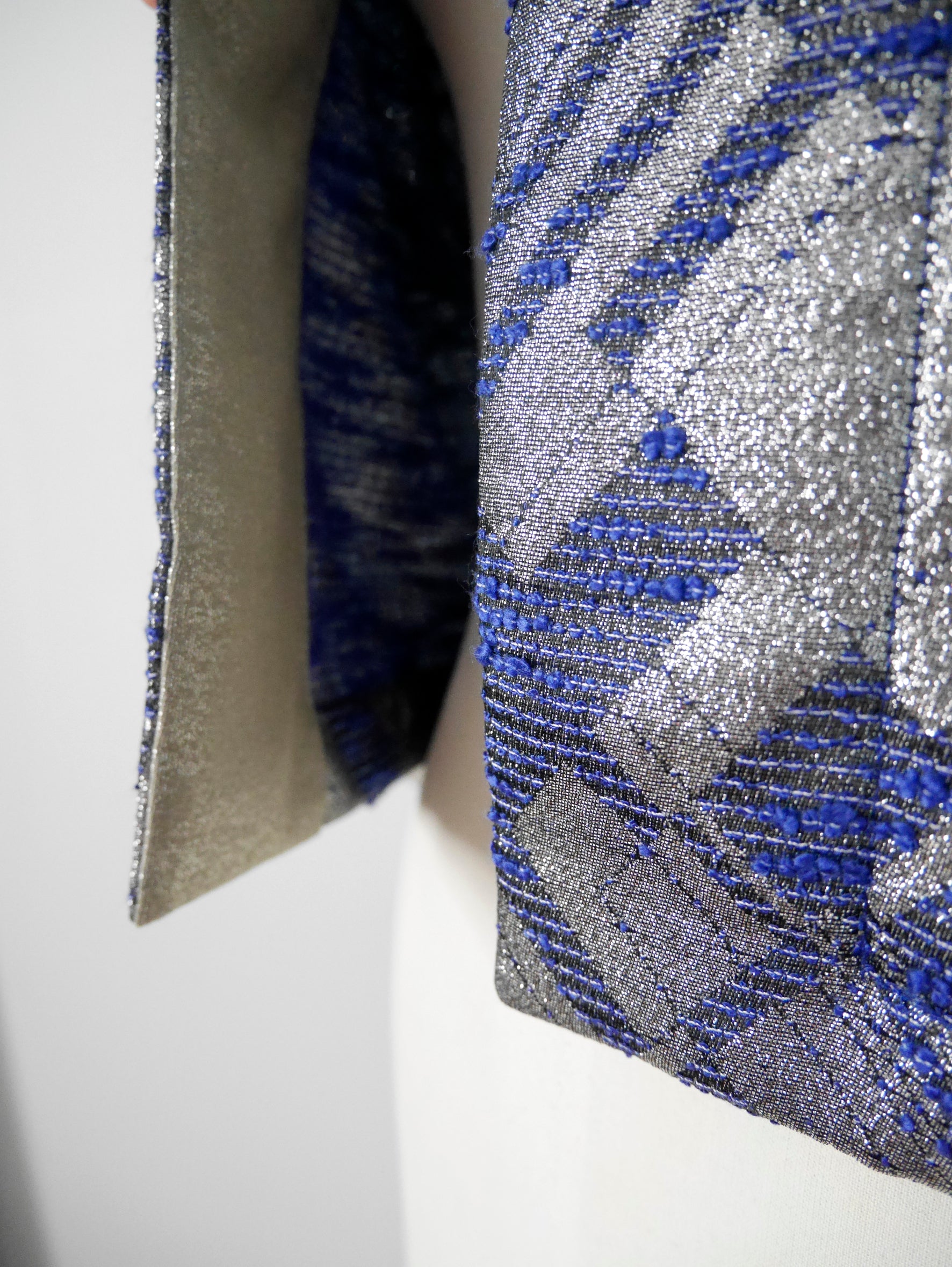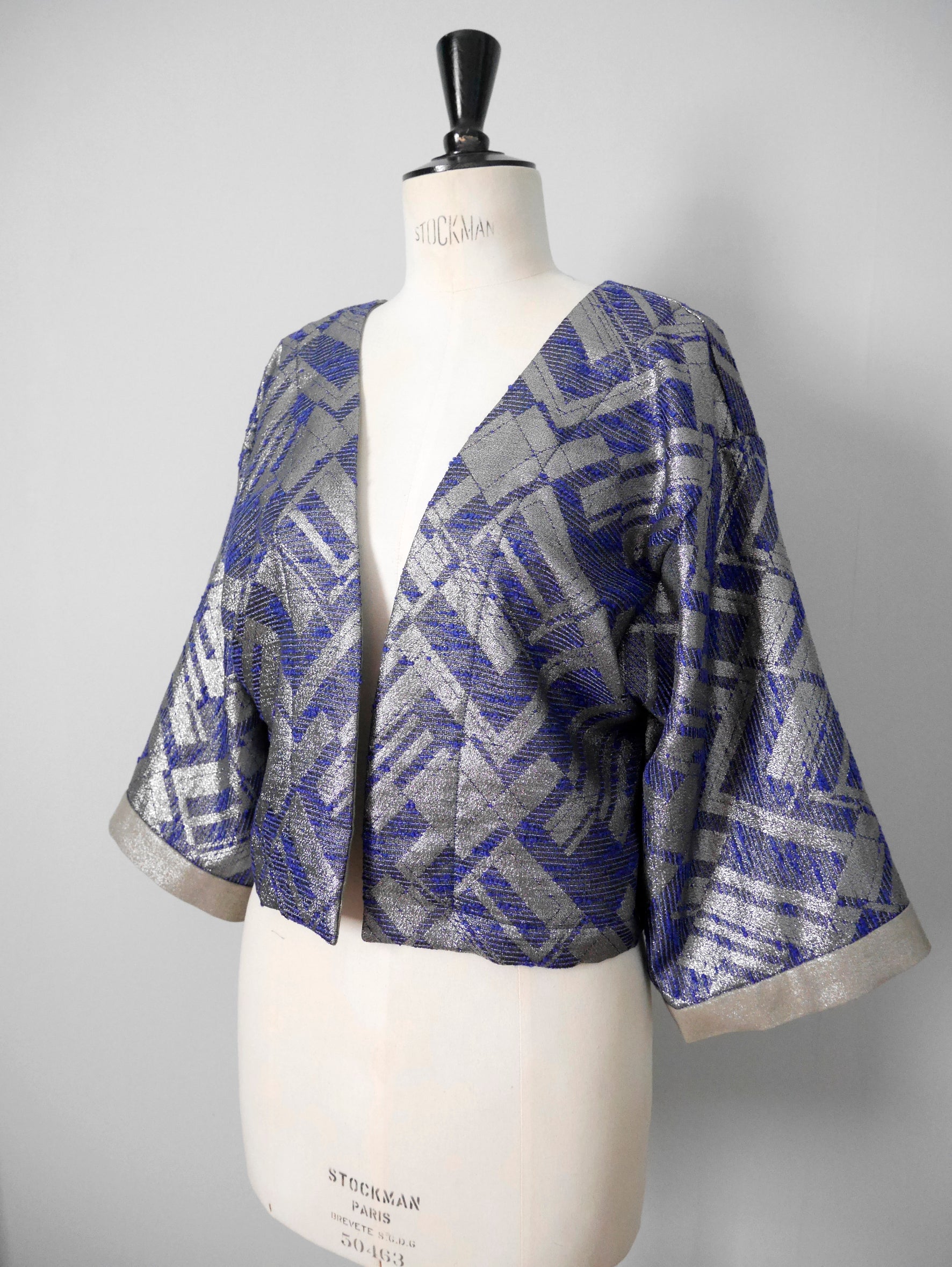 • Veste courte inspirée du kimono en brocart fluide qui forme des motifs géométriques d'inspiration art déco, couleur bleu électrique et lurex argenté.Le col et les devants sont doublé en en forme large d'un tissu brillant assorti. Manches larges également terminées par un poignet uni. La veste se porte bort à bord.