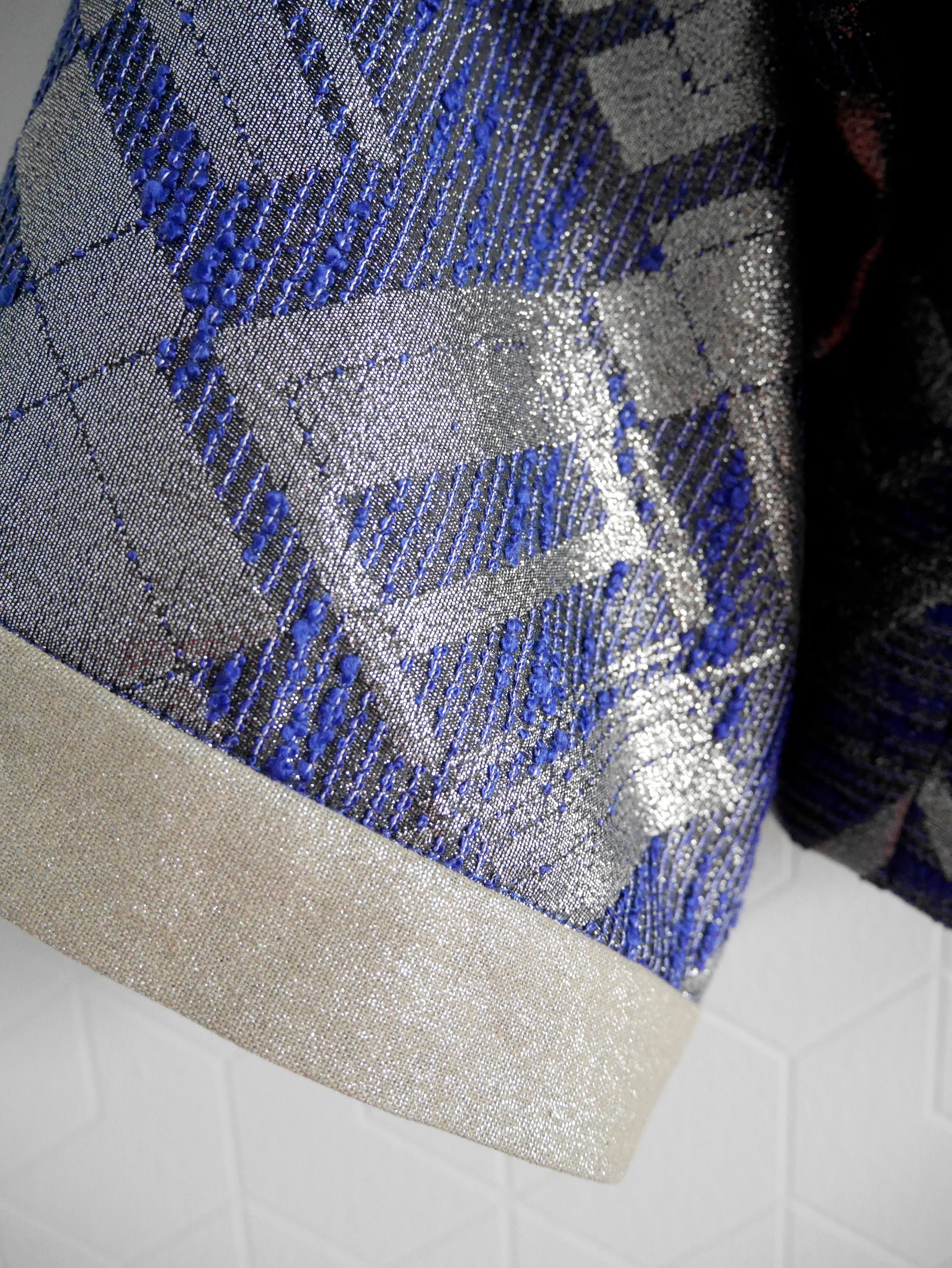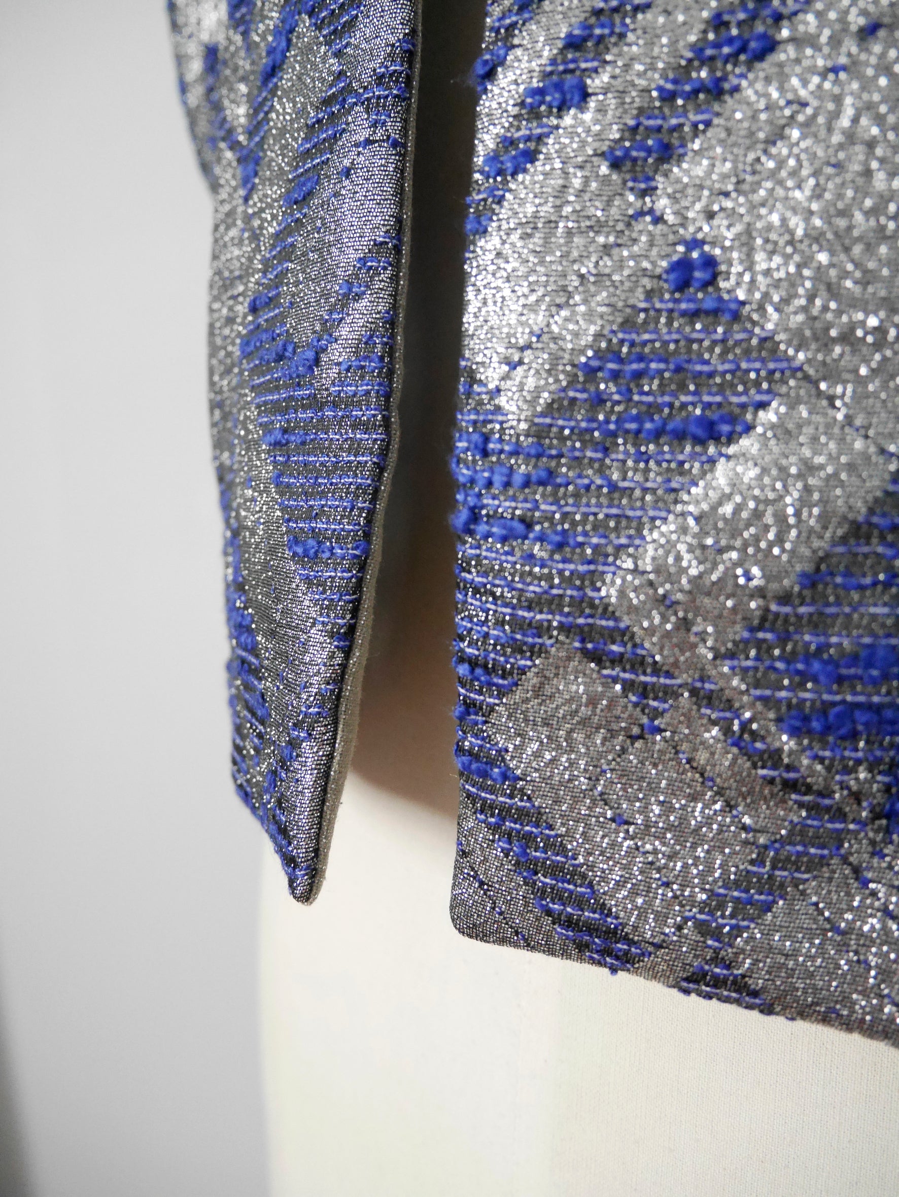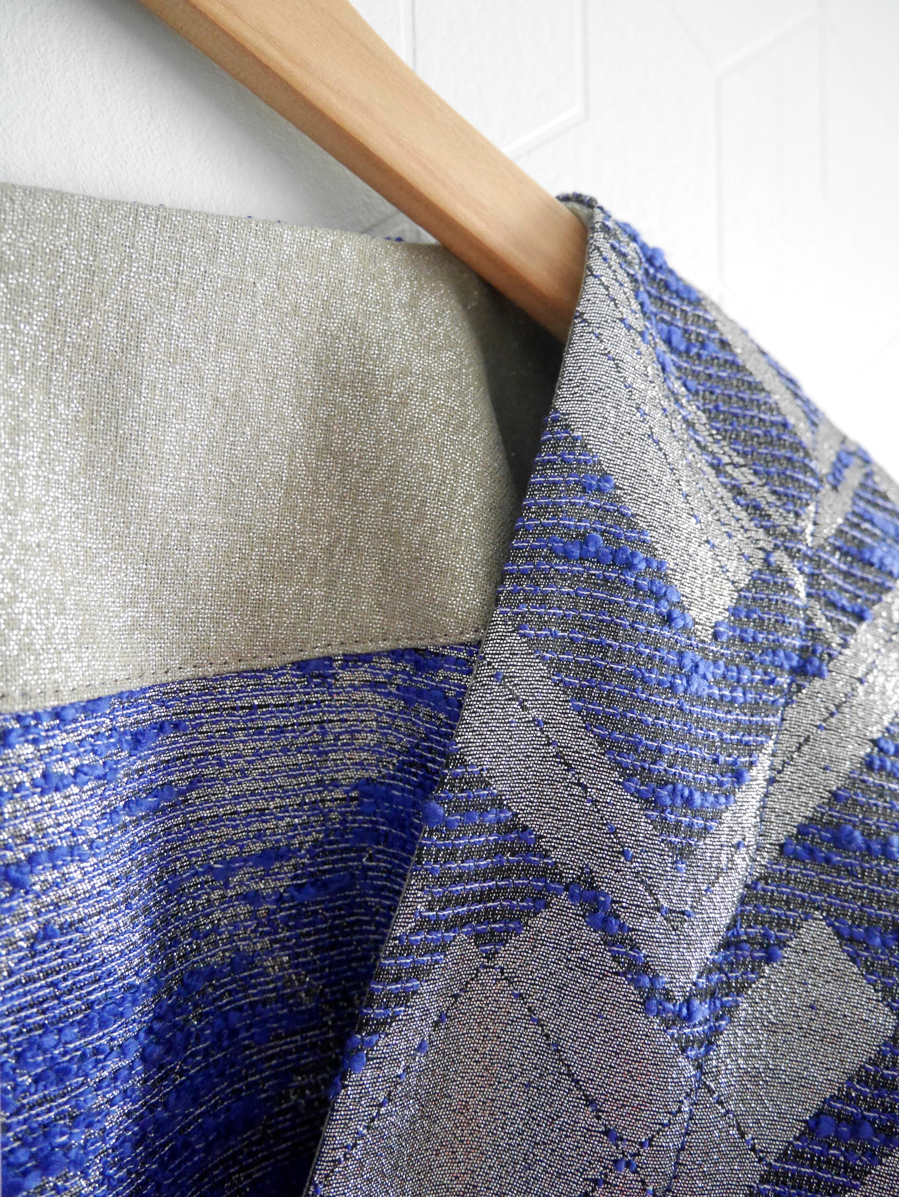 • Veste courte inspirée du kimono en brocart fluide qui forme des motifs géométriques d'inspiration art déco, couleur bleu électrique et lurex argenté.Le col et les devants sont doublé en en forme large d'un tissu brillant assorti. Manches larges également terminées par un poignet uni. La veste se porte bort à bord.
