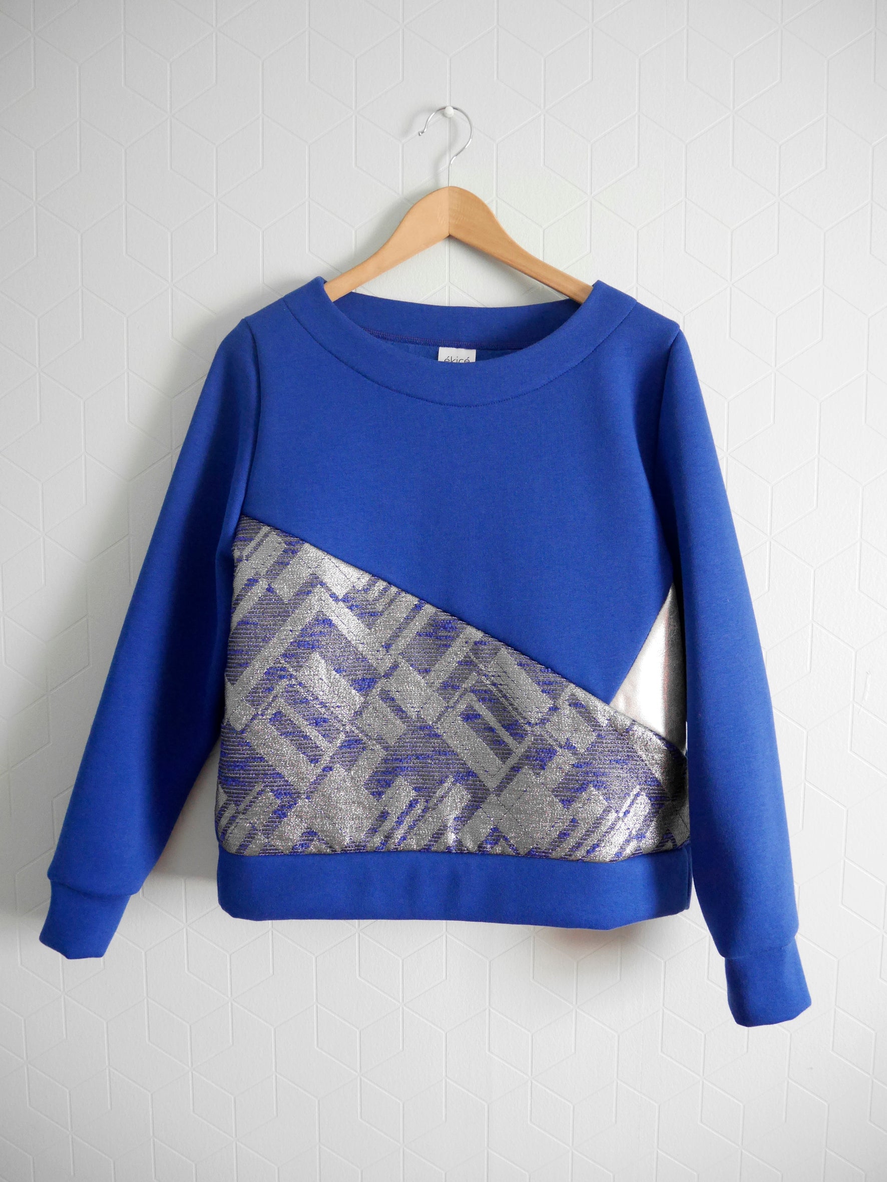 Épaules ajustés, manches longues resserrées par un bord côte aux poignets, col rond doublé du même tissu. Grand triangle contrastant devant dans un tissu brocart en lurex argenté et bleu électrique, aux motifs art déco, et petit triangle sur le côté en simili cuir argenté. Bord large en bas façon sweat.