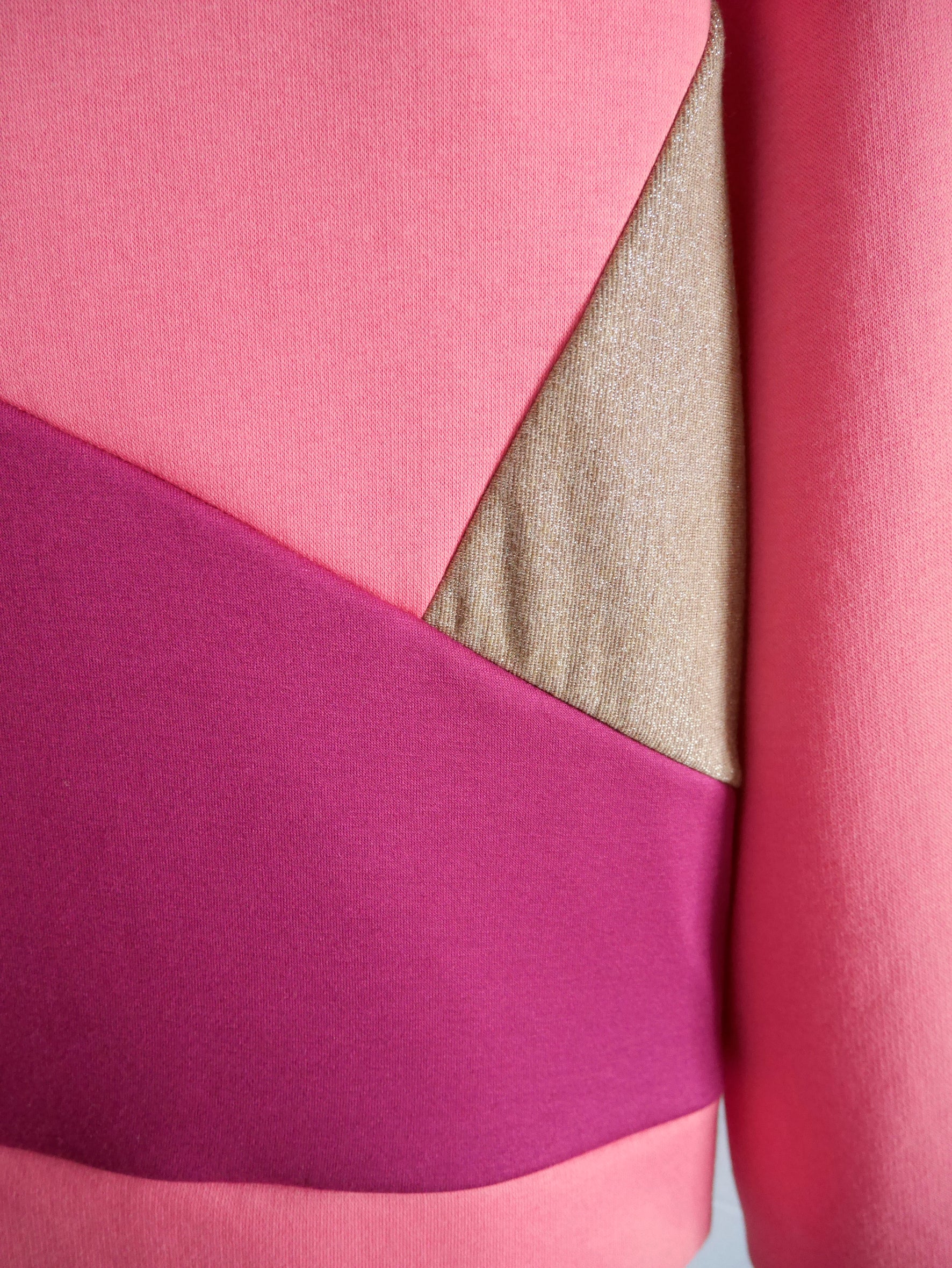 Épaules ajustés, manches longues resserrées par un bord côte aux poignets, col rond doublé de coton fuchsia à petits motifs. Grand triangle contrastant devant couleur rose fuchsia et petit triangle sur le côté couleur doré. Bord large en bas façon sweat.