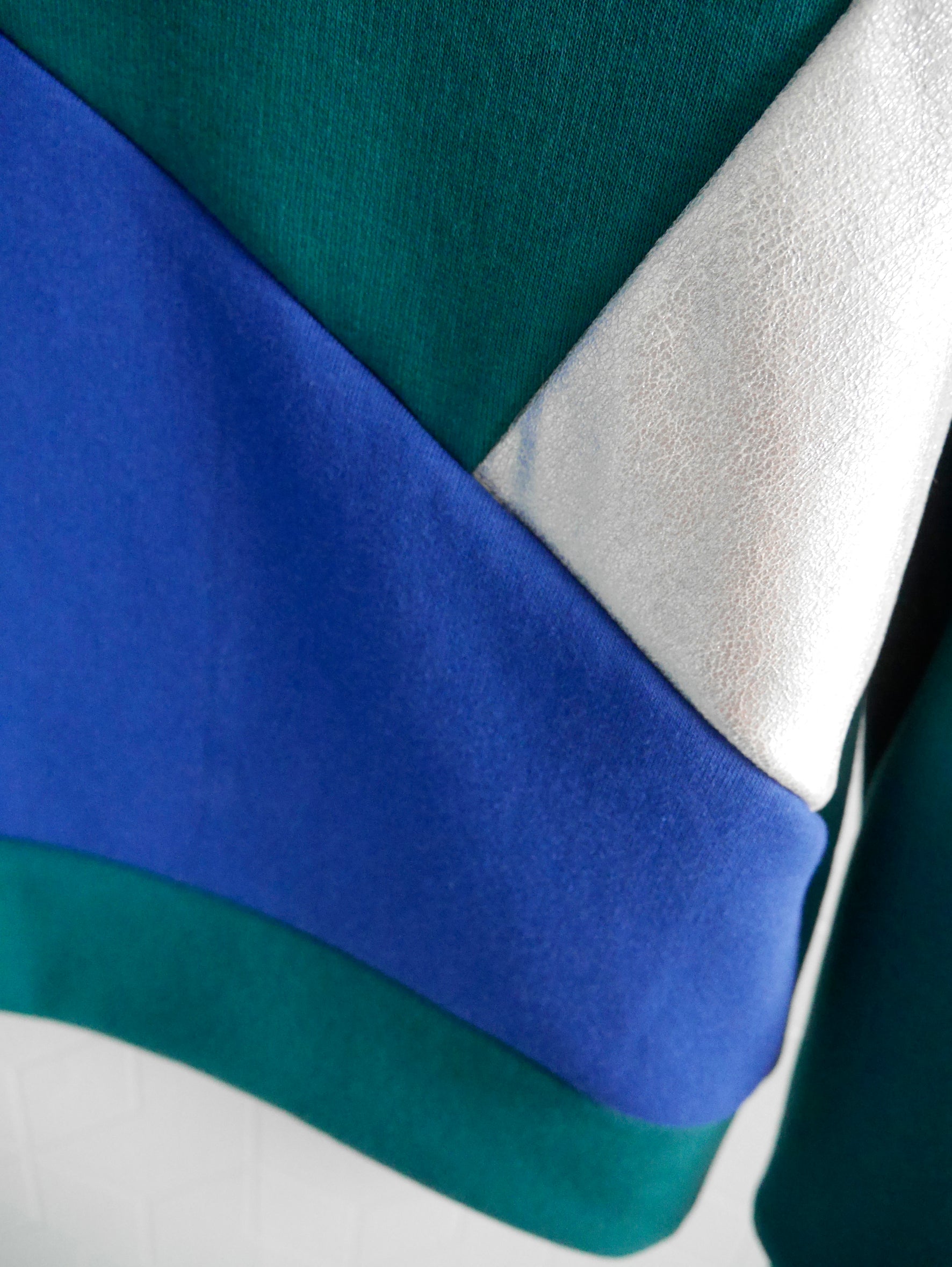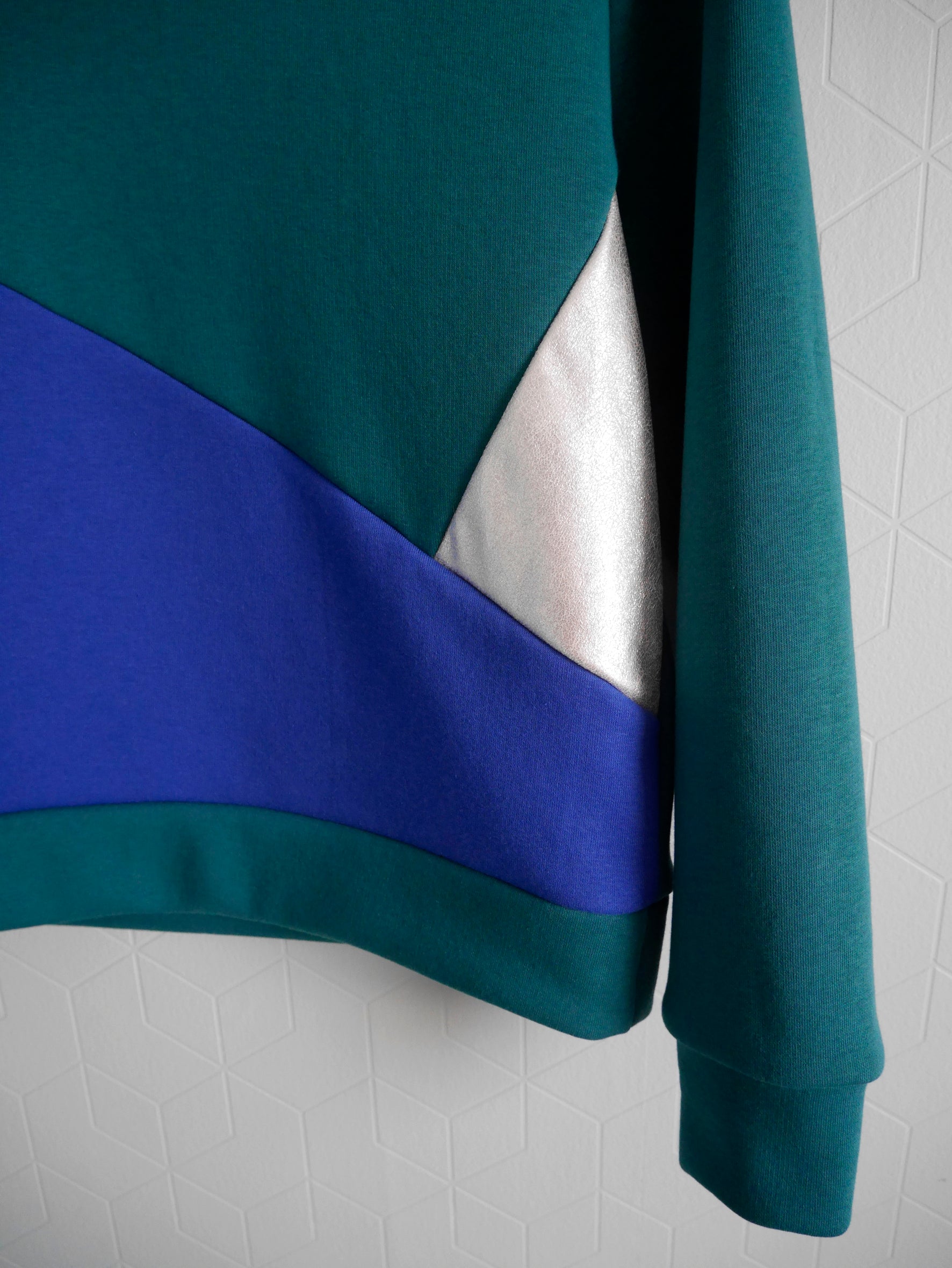 Épaules ajustés, manches longues resserrées par un bord côte aux poignets, col rond et dégagé. Grand triangle contrastant devant de couleur bleu électrique et petit triangle sur le côté en simili cuir argenté. Bord large en bas façon sweat.