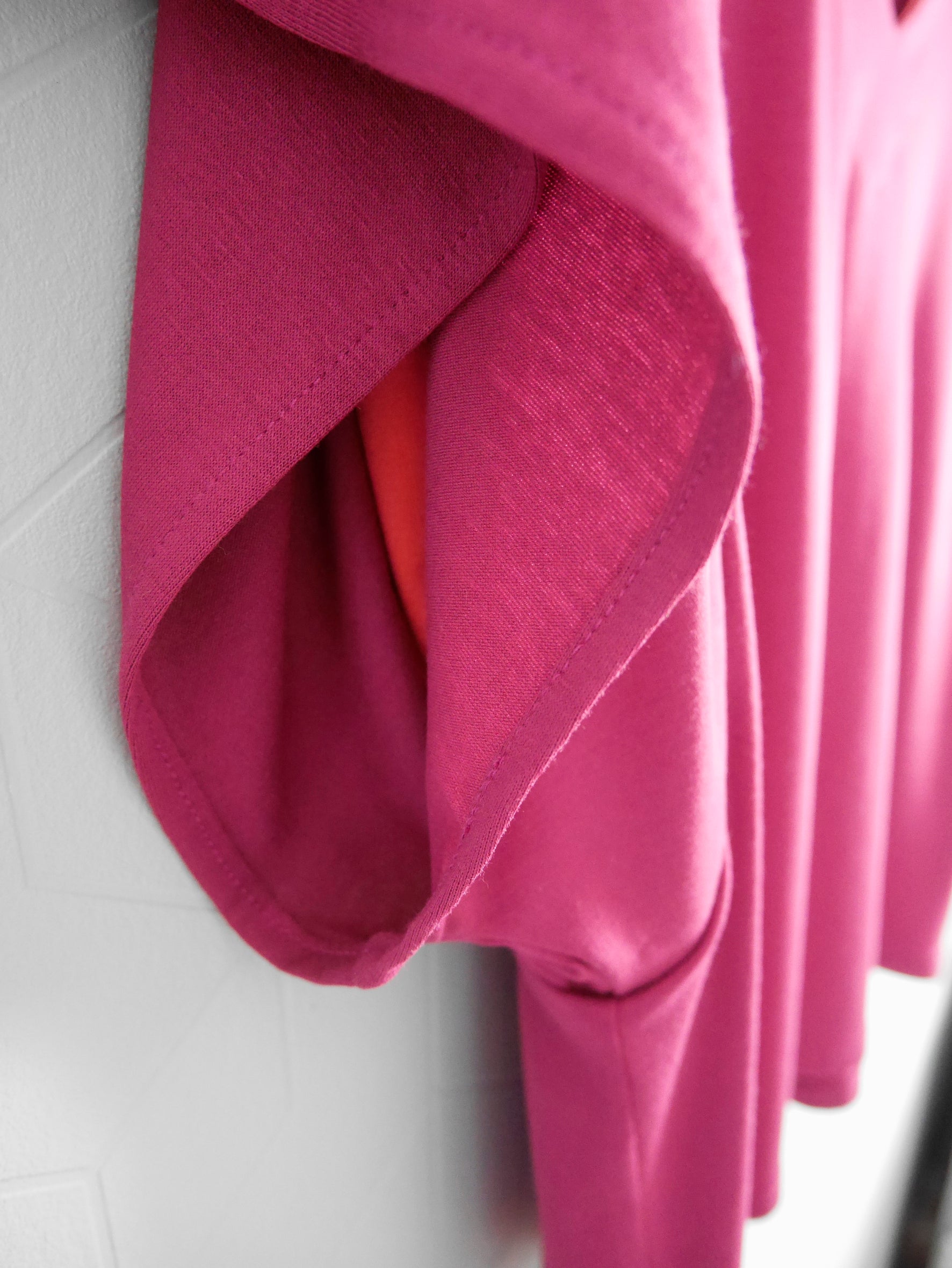• Teeshirt hyper fluide à manches très larges en jersey fin couleur rose fuchsia. Grand col V, doublé de jersey uni orange doux. Coupe droite, manches larges et échancrées, avec une pièce sous les bras en jersey orange doux, qui donne l'illusion d'un autre top dessous.